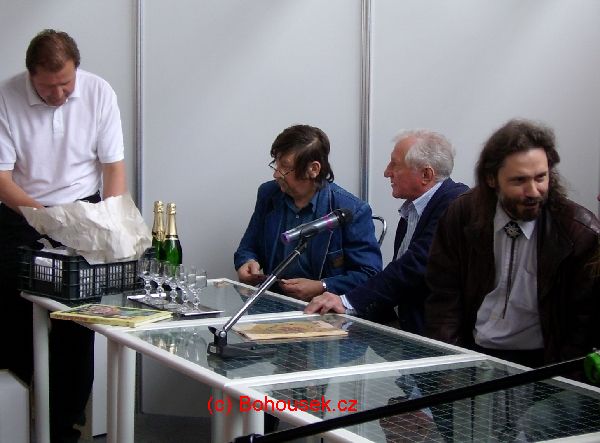 Za stolek, kde se již připravovalo šampaňské ke křtu, dále usedli grafik Oldřich Pošmurný, zpěvák Pavel Bobek, kreslíř Milan Teslevič, autorka scénáře ke komixu Ivana Peroutková, kytarista Jan Matěj Rak a zpěvák František Vlček. Slavnostní okamžik nastal symbolicky ve 13 hodin 13 minut, kdy Pavel Bobek provedl samotný křest knihy.