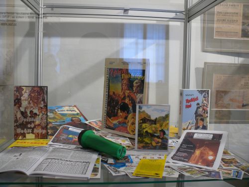Dílem okamžiku byl přesun přes náměstí kolem dvou barevných plakátků avizujících výstavu do domu Mince. Zde jsme si prohlédli prodejnu se suvenýry (k dispozici 3 foglarovské pohlednice, výroční turistická známka, knihy Stoletý hoch od Bobří řeky a Zápisník 13 bobříků) a zakoupili vstupenky. Ty nás překvapily svojí strohostí - jde totiž o pouhý pokladní blok. Pak nás už místní průvodce uvedl do suterénních prostor, kde probíhají krátkodobé výstavy a s několika slovy o Jaroslavu Foglarovi, a také informací, že další výstavy probíhají v Praze a Brně, nás propustil.