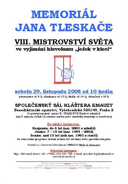Memoriál Jana Tleskače - VIII. mistrovství světa ve vyjímání hlavolamu „ježek v kleci“[ Autor: Slavomil Janov - Nashville | zařazeno: 20. 11. 2008 | přečteno 20175 ] Ježek v kleci je bezesporu nejznámějším českým hlavolamem. Jeho princip vychází ze dva tisíce let starého čínského hlavolamu v podobě hada, který svírá mořskou hvězdici. Ze sevření plaza lze hvězdici vysvobodit krouživými pohyby. Podobným způsobem se vyjímá i ježek z klece. První hlavolamy v podobě ježka v kleci byly vyrobeny na přelomu 19. a 20. století a následně patentovány v USA a Japonsku. Ve dvacátých letech minulého století se hlavolam objevil i v Evropě. Zcela nezávisle na této skutečnosti jej v roce 1940 zakomponoval do svého románu Záhada hlavolamu spisovatel Jaroslav Foglar. Napínavý dobrodružný příběh chlapeckého klubu Rychlé šípy a tajemnou legendou opředený hlavolam, jehož vyjmutí ovládal v románu pouze tragický zemřelý zámečnický učeň Jan Tleskač – vynálezce „létacího kola“ – vytvořily z Foglarovy knihy bestseller české literatury pro mládež a z ježka v kleci kultovní hračku. Mimořádný čtenářský ohlas románu Záhada hlavolamu (i následujících Foglarových knih Stínadla se bouří a Tajemství Velkého Vonta, které společně tvoří ucelenou trilogii) a brilantní „literární marketing“ tajuplného hlavolamu vytvořily z ježka v kleci fenomén, který u nás přetrvává již více než půl století. V roce 2001, při příležitosti 60. výročí prvního vydání Záhady hlavolamu, byla uspořádána premiérová soutěž ve vyjímání ježka z klece pod názvem Memoriál Jana Tleskače. V úvodním i následujících ročnících akce, jejíž součástí je také kategorie pro pacienty z dětských oddělení nemocnice v Praze-Motole, se do netradičního klání zapojili nejen soutěžící z České republiky, ale i dalších zemí. Dosud se tak akce zúčastnilo na 1500 startujících ze 13 zemí (Austrálie, Bosna a Hercegovina, Česko, Itálie, Maďarsko, Makedonie, Mongolsko, Nizozemsko, Polsko, Rusko, Slovensko, Srbsko a Ukrajina). Soutěž je proto organizována jako mistrovství světa a letos se uskuteční již po osmé. Organizátoři očekávají také start závodníků ze Severní Ameriky a Afriky. O titul mistra světa se v Memoriálu Jana Tleskače bojuje ve třech věkových kategoriích – do 6 let, do 15 a nad 15 let. Soutěží se s univerzálním a v obchodech běžně dostupným kovovým hlavolamem (značka Philos, viz foto). Jedná se o kvalitní německý výrobek, jehož parametry zaručují regulérnost, ale i náročnost soutěže. Úkolem soutěžících je vyjmout ježka z klece v co nejkratším čase. Časový limit pro hodnocení do soutěže jsou 3 minuty. V dosavadní historii šampionátů dosáhl nejrychlejšího času dvojnásobný mistr světa (2004 a 2006) Jan Trojan z Mělníka výkonem 3 vteřiny! Nejmladším účastníkem dosavadních sedmi šampionátů byl roční chlapec (s hlavolamem zápolil mimo soutěž s pomocí rodičů), věk nejstarších soutěžících je přes 75 let. Letošní VIII. ročník Memoriálu Jana Tleskače – mistrovství světa ve vyjímání ježka z klece se uskuteční v sobotu 29. listopadu od 10 hodin: prezentace od 9 h, eliminace od 10 h, finále od 14 h, ukončení v 16 h Společenský sál kláštera Emauzy, Benediktinské opatství (Na Slovanech), Vyšehradská 320/49, Praha 2 Dopravní spojení: metro B, TRAM, BUS Karlovo náměstí (asi 3 minuty chůze od stanice metra nebo zastávky tramvaje a autobusu) Soutěžní kategorie: Benjamin: do 6 let (nar. 2003 a mladší) Junior: 7 – 15 let (nar. 1994 – 2002) Senior: nad 15 let (rok nar. 1993 a starší) Do rámcového programu soutěže mohou být zařazeny další speciální kategorie. Pořádají a zvou: Sdružení přátel Jaroslava Foglara, Pražská pobočka JUNÁK – svaz skautů a skautek ČR, Pražský kraj A. B. Svojsíka Slavomil Janov – NASHVILLE Agency (Akademie Jaroslava Foglara) a 48. klub old-skautů Jestřábi, Praha V rámci akce bude probíhat i doprovodný program: výstava kreseb Milana Tesleviče (100+1 portrétů Jaroslava Foglara a ilustrací ke spisovatelově románům), doplňkové hry a soutěže pro děti, prezentace činnosti Sdružení přátel Jaroslava Foglara a Junáka, křest výroční turistické známky k 10. výročí úmrtí Jaroslava Foglara (+23. 1. 1999) a další aktivity. V rámci programu bude rovněž připomenuto letošní 70. výročí legendárního klubu Rychlé šípy, jejichž první kreslený příběh (scénář Jaroslav Foglar, kresba Jan Fischer) vyšel 17. prosince 1938 v časopise Mladý hlasatel. Popularitu a rozšířenost hlavolamu „ježek v kleci“, která již dosáhla široké mezinárodní dimenze, přiblíží návštěvníkům expozice zahraničních výrobků „ježka v kleci“ (USA, Tchajwan…) a fotografií, jež zachycují zápolení s hlavolamem nejen v předchozích ročnících akce, ale i na světovém skautském jamboree ve Velké Británii 2007. V této kolekci má výjimečné postavení snímek, na němž vyjímá ježka z klece Dalajláma. Tibetský duchovní vůdce obdržel tento hlavolam jako dárek při jedné ze svých předchozích návštěv České republiky. Podrobné informace o Memoriálu Jana Tleskače – VIII. MS ve vyjímání ježka z klece poskytne hlavní organizátor akce a ředitel soutěže Mgr. Slavomil Janov, tel: (+420) 602 686 725, e-mail: jaroslav.foglar@email.cz.