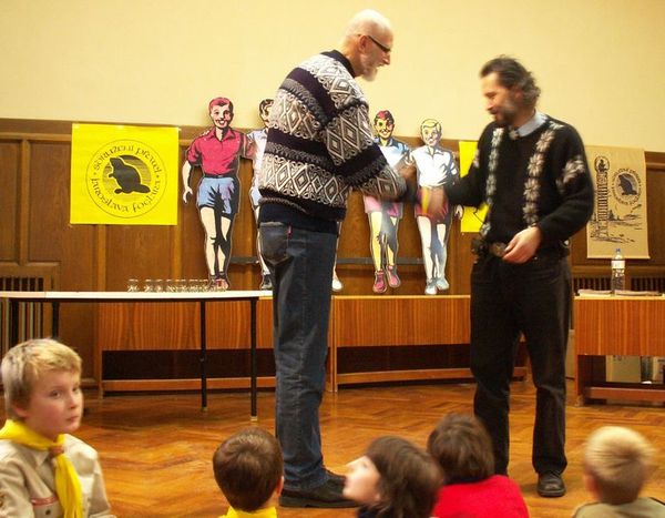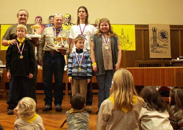 Memoriál Jana Tleskače 2008 zná nové premianty[ Autor: Slavomil Janov - Nashville | zařazeno: 3. 12. 2008 | přečteno 18510 ] Již po osmé se podzimní Praha stala hostitelkou soutěže ve vyjímání hlavolamu ježek v kleci – Memoriálu Jana Tleskače. K zápolení, které zdobí visačka světového šampionátu v této originální disciplíně, se do společenského sálu kláštera Emauzy ve Vyšehradské ulici (Na Slovanech) sjelo osm desítek startujících. Oproti předchozím ročníkům se souboje s hlavolamem a proti chronometru omezily jen na česko-slovenský duel. Organizátoři sice podle startovní listiny vyvěsili v sále vlajky tří zemí, ale jeden z borců v juniorské kategorii, který díky dvojímu občanství mohl startovat v reprezentačním dresu Itálie i v českých barvách, zvolil domácí variantu. Vzdor užší mezinárodní konkurenci a komornějšímu charakteru akce (oproti loňskému sedmému ročníku, který byl součástí oslav 100. výročí narození Jaroslava Foglara) bylo však i letos v areálu Benediktinského opatství k vidění nemálo zajímavého a dramatického. Takže pěkně po pořádku… Průběh soutěže Stejně jako před rokem, se i letos soutěžilo s německým kovovým hlavolamem značky Philos. Pro hodnocení do soutěže i zápisu do historického žebříčku bylo třeba vyjmout ježka z klece v časovém limitu tří minut. Německý hlavolam je vzhledově podobný českému výrobku brněnské firmy Hron, ale rozdíly ve velikosti ostnů a jejich odlišný sklon řadí Philos do kategorie náročnějších hlavolamů. Přesto se s ním úspěšně poprala většina startovního pole. Jen v několika případech zůstala záhada hlavolamu nerozluštěna i přes možnost soutěžících dosáhnout kýženého výsledku nejen v základním kole, ale i v opravném pokusu – baráži. Soutěž byla vypsána standardně pro tři věkové kategorie. V nejmladší – do šesti let (Benjamin) – se však nesešel dostatečný počet startujících, které určuje reglement pro soutěž mistrovství světa. Alespoň minimální obsazení této kategorie zajistili pravidelní účastníci akce, manželé Hana a Jaromír Krejčovi ze skautského střediska Oregon Neratovice, přihlášením dvojice svých potomků – pětiletého Ondřeje a dvouleté Barbory. Vzhledem k věku obou benjamínků se nedalo očekávat, že by na náročný hlavolamem některý ze sourozenců vyzrál. Malá Barbora se sice snažila uspět i kousáním do klece, leč Philos odolal. O tři roky starší Ondra bojoval opravdu srdnatě, ale ani jeho píle, ani vztek či mohutné povzbuzování publika ovoce nepřinesly. Oběma tak připadla jen sladká odměna v podobě – rovněž již tradičního – dortu ve tvaru hlavolamu: ježek byl cukrářským mistrem vymodelován z čokoládového a vanilkového krému a klec sestavena z lázeňských oplatek a hořických trubiček. Nejpočetněji obsazená bývá každoročně soutěž juniorů do 15 let. Bylo tomu tak i letos, kdy se do startovní listiny zapsalo 47 chlapců a dívek. V silné konkurenci se role černého koně zhostil nejlépe osmiletý Jan Fiala. Navzdory nízkému věku i nevelkému vzrůstu výrazně převýšil mnohem starší a ostřílenější soupeře už v eliminaci. V ní dosáhl času 40,9 vteřiny. Když pak ve finále dokázal vyjmout ježka z klece za čtvrtinu vstupního času, bylo o novém premiantovi rozhodnuto. Na stříbrný stupínek se trochu překvapivě vyšplhala debutantka v soutěži, desetiletá Eliška Oravcová. Ačkoliv v doprovodu svého otce Luboše, aktivního člena pořádající Pražské pobočky Sdružení přátel Jaroslava Foglara (SPJF), nechyběla na akci ani v několika předchozích ročnících, dosud zůstávala jen mezi diváky. K soutěži se odhodlala až nyní. Cestu do dvanáctičlenného finále si sice musela proklestit i účastí v baráži, ale mezi elitou nakonec časem 53,6 vteřiny zazářila. Také jí proto hlavní ceremoniář Marek Polák – Sharp z vedení SPJF právem pověsil na krk druhou nejcennější medaili. Poslední volné místo „na bedně“ pak připadlo Ondřeji Piekarzovi. Do soutěže seniorů (ročník narození 1993 a starší) se přihlásily rovné tři desítky borců. Při neúčasti dvojnásobného mistra světa a držitele světového rekordu (3 vteřiny) Jana Trojana – Roye z Mělníka, byla pozornost publika upřena hlavně na vystoupení dvou nejúspěšnějších účastníků loňského setkání mistrů – Světového poháru 2007 – Jana Machálka z Brna a Michaela Mráze z Prahy. Letošní klání ovšem favorizovaného zástupce Moravy nezastihlo v ideální formě a mezi smetánku se neprobojoval. Namále měl i Mráz, který se nakonec do finále propracoval z předposledního postupového místa. V závěrečném souboji se soupeři si ovšem předchozí „klopýtání“ vynahradil: v duelu o zlatou medaili přesto prohrál se šťastnějším protivníkem. Tím šťastnějším byl o pouhou desetinu vteřiny Lubomír Melichařík. Třiapadesátiletý veterán a pravidelný účastník Memoriálu Jana Tleskače korunoval svoji snahu výborným výkonem 20,1 vteřiny a ziskem zlaté medaile. Za obdobnou vytrvalost byl odměněn i třetí v pořadí Miloš Kříž, vůdce smečky vlčat pražského skautského střediska Atahokan-bratří Mašínů. V uplynulých letech přivedl ke stupňům vítězů několik svých svěřenců, nyní se cenného kovu dočkal sám. Doprovodný program Před rokem dotvářel kulisu soutěžní arény – vedle již tradičních figurín Rychlých šípů v průčelí sálu – zámečnický učeň Jan Tleskač. V sedle a za řídítky svého létacího bicyklu se vznášel vznešeně nad hlavami aktérů akce. Letos se na svůj memoriál podívat nepřiletěl, ale místo uvolnil dalšímu literárnímu hrdinovi z Foglarovy románové tri