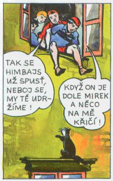 Tak či tak, Rychlé šípy už každopádně pracují "shora" a Micce prostě spouštějí její vlastní bedničku – i s miskou mléka. Všimněme si však, že dole - vedle průjezdu - najednou přibyly dvě římsy a snad i okna. Akce, jak nám dochází, tím pádem probíhá ve třetím patře.