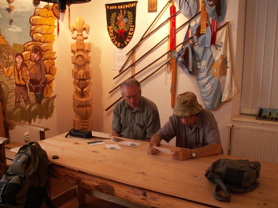 Na fotografii je Oldřich Pošmurný (vpravo) s autorem textu Václavem Noskem – Windym na výstavě skautských pohlednic v skautském muzeu na zámku Nižbor v létě 2009. Foto: Milan Lebeda |