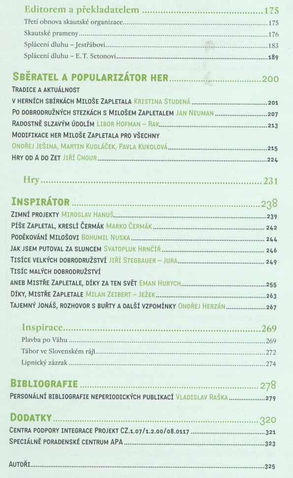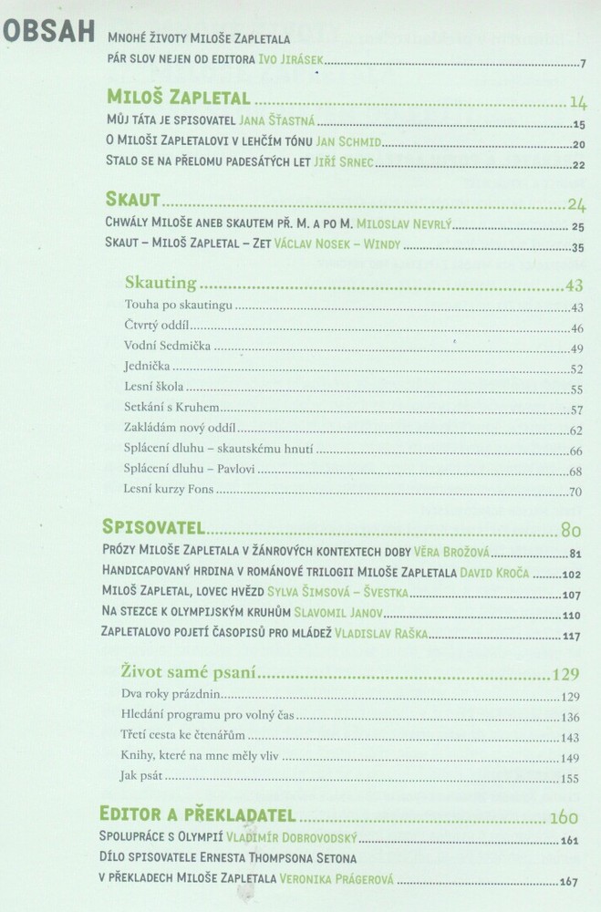 ZET. Pět životů: Ojedinělý sborník k osmdesátinám Miloše Zapletala právě vyšel. Obsahuje i dosud nevydané vzpomínky loňského jubilanta.[ Autor: Bohoušek | zařazeno: 10. 2. 2011 | přečteno 15794 ] Kniha – sborník „ZET. Pět životů“ je vydána při příležitosti loňského 80. výročí narození spisovatele, překladatele, editora, sběratele a popularizátora her, Miloše Zapletala (nar. 13. 1. 1930), známého pod skautskou přezdívkou Zet. Pravidelně střídá dva styly: Sborníkové příspěvky autorů, lišící se formou (odborné studie, osobní vzpomínky, reflexe či vyznání) a vyjadřující se k různým aspektům Zapletalovy činnosti. Ty jsou prokládány výběrem podstatné části dosud nevydaného životopisného vzpomínání Miloše Zapletala nazvaného Pět životů. Právě tato část knihy bude pro mnohé čtenáře zřejmě objevným čtením, neboť Miloš Zapletal dosud takto rozsáhlý text věnovaný svým vzpomínkám nikdy ke zveřejnění neuvolnil. Čerstvá novinka je k dostání v internetovém obchůdku ORIN u příležitosti dvaceti let od založení ORINu se speciální výroční slevou 70 korun - za mimořádných 260 korun. Kromě spíše osobně laděného úvodu je sborník tematicky rozčleněn do pěti částí: první oddíl mapuje jeho skautskou činnost a výchovné působení, následuje kariéra spisovatele, poté editora a překladatele, sběratele a popularizátora her a konečně poskytovatele inspirací k osobnostnímu rozvoji čtenářů, spolupracovníků či přátel. Sborník uzavírá pečlivě utříděná bibliografie se základním představením publikací, na nichž se tvůrčím způsobem Zapletal podílel ve výše jmenovaných rolích. Text je doprovázen množstvím většinou dosud nepublikovaných fotografií. Počet stran: 334 Formát: 16 x 23 cm Vazba: vázaná Barevnost: dvoubarevná Rok vydání: 2010 (fakticky vydáno v lednu/únoru 2011) Vydání: 1. Edice Gymnasion, svazek 02 (sborník navazuje na svazek č. 1: Fenomén Foglar, r. 2007) Vydavatel: Univerzita Palackého v Olomouci Doporučená prodejní cena: 330 Kč Výroční sleva u ORINu: cena 260 Kč Možnost objednávky v obchůdku ORIN ZDE. Obsah: Mnohé životy Miloše Zapletala pár slov nejen od editora: Ivo Jirásek / 7 Miloš Zapletal / 14 Můj táta je spisovatel: Jana Šťastná / 15 O Miloši Zapletalovi v lehčím tónu: Jan Schmid / 20 Stalo se na přelomu padesátých let: Jiří Srnec / 22 Skaut / 24 Chwály Miloše aneb skautem př. M. a po M.: Miloslav Nevrlý / 25 Skaut – Miloš Zapletal – Zet: Václav Nosek – Windy / 35 Skauting / 43 Touha po skautingu / 43 Čtvrtý oddíl / 46 Vodní Sedmička / 49 Jednička / 52 Lesní škola / 55 Setkání s Kruhem / 57 Zakládám nový oddíl / 62 Splácení dluhu – skautskému hnutí / 66 Splácení dluhu – Pavlovi / 68 Lesní kurzy Fons / 70 Spisovatel / 80 Prózy Miloše Zapletala v žánrových kontextech doby: Věra Brožová / 81 Handicapovaný hrdina v románové trilogii Miloše Zapletala: David Kroča / 102 Miloš Zapletal, lovec hvězd: Sylva Šimsová – Švestka / 107 Na stezce k olympijským kruhům: Slavomil Janov / 110 Zapletalovo pojetí časopisů pro mládež: Vladislav Raška / 117 Život samé psaní / 129 Dva roky prázdnin / 129 Hledání programu pro volný čas / 136 Třetí cesta ke čtenářům / 143 Knihy, které na mne měly vliv / 149 Jak psát / 155 Editor a překladatel / 160 Spolupráce s Olympií: Vladimír Dobrovodský / 161 Dílo spisovatele Ernesta Thompsona Setona v překladech Miloše Zapletala: Veronika Prágerová / 167 Editorem a překladatelem / 175 Třetí obnova skautské organizace / 175 Skautské prameny / 176 Splácení dluhu – Jestřábovi / 183 Splácení dluhu – E. T. Setonovi / 189 Sběratel a popularizátor her / 200 Tradice a aktuálnost v herních sbírkách Miloše Zapletala: Kristina Studená / 201 Po dobrodružných stezkách s Milošem Zapletalem: Jan Neuman / 207 Radostně slzavým údolím: Libor Hofman – Rak / 213 Modifkace her Miloše Zapletala pro všechny: Ondřej Ješina, Martin Kudláček, Pavla Kukolová / 215 Hry od A do Zet: Jiří Chour / 224 Hry / 231 Inspirátor / 238 Zimní projekty: Miroslav Hanuš / 239 Píše Zapletal, kreslí Čermák: Marko Čermák / 242 Poděkování Milošovi: Bohumil Nuska / 244 Jak jsem putoval za sluncem: Svatopluk Hrnčíř / 246 Tisíce velkých dobrodružství: Jiří Stegbauer – Jura / 249 Tisíc malých dobrodružství aneb Mistře Zapletale, díky za ten svět: Eman Hurych / 255 Díky, Mistře Zapletale: Milan Zeibert – Ježek / 263 Tajemný Jonáš, rozhovor s buřty a další vzpomínky: Ondřej Herzán / 267 Inspirace / 269 Plavba po Váhu / 269 Tábor ve Slovenském ráji / 272 Lipnický zázrak / 274 Bibliografe / 278 Personální bibliografe neperiodických publikací: Vladislav Raška / 279 Dodatky / 320 Centra podpory integrace Projekt CZ.1.07/1.2.00/08.0117 / 321 Speciálně poradenské centrum APA / 323 Autoři / 325