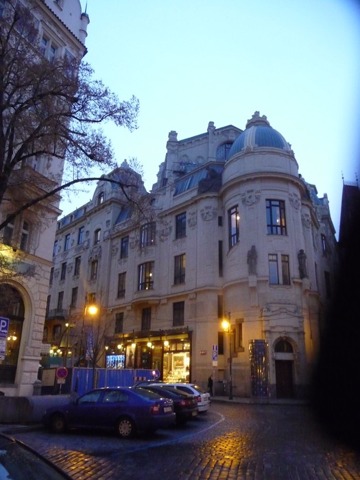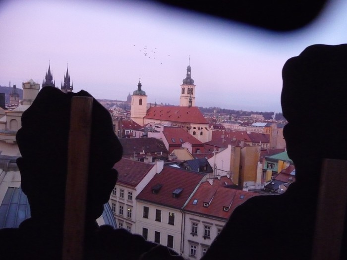 Na obrázku zvonice u Svatého Jakuba, hotel s ptákem Marabu (?) na střeše a probouzející se den.
