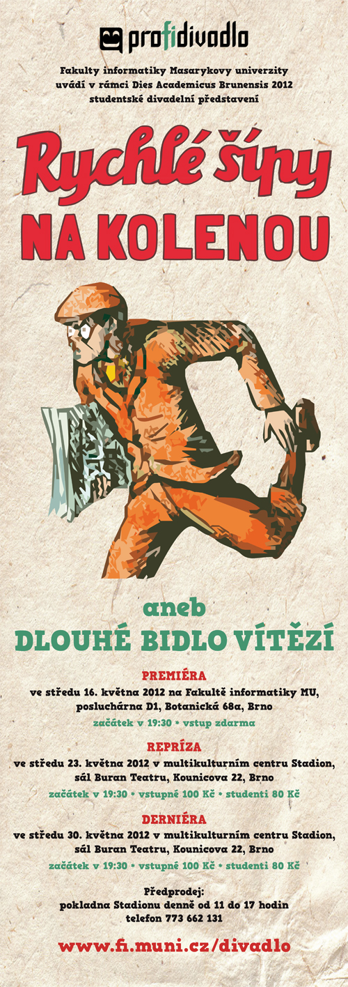 Ve středu 30. 5. 2012 jsme společně s mojí paní, dcerou a kamarádem navštívili divadelní představení brněnského amatérského Profidivadla (divadlo na Fakultě informatiky Masarykovy univerzity v Brně) Rychlé šípy na kolenou aneb Dlouhé Bidlo vítězí. Po tvrdé kritice, kterou na internetových stránkách napsal divák, který představení zhlédl minulý týden, a po zjištění, že Rychlé šípy budou zataženy do komunistických procesů v 50. letech minulého století, jsme byli plni napětí a obav.