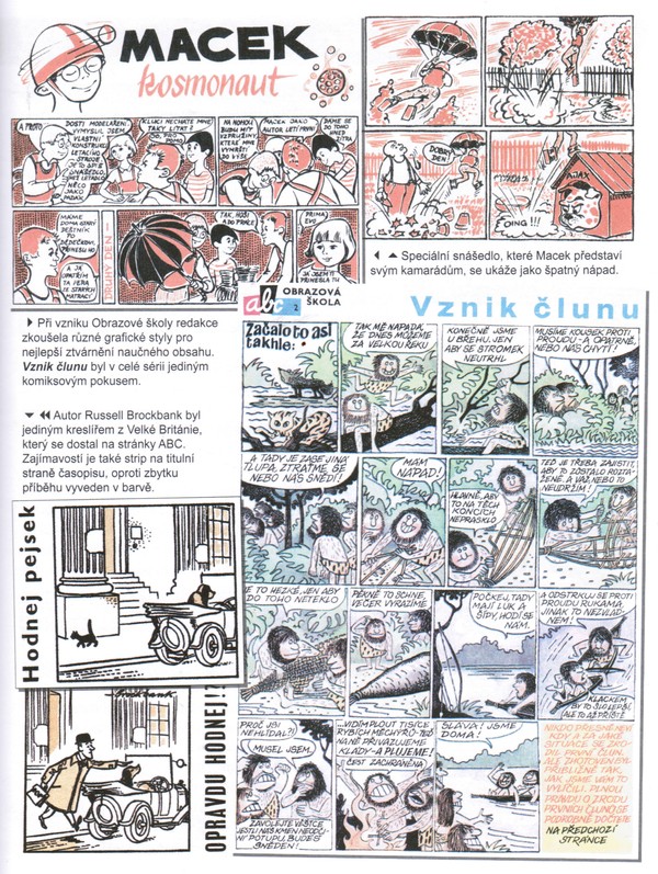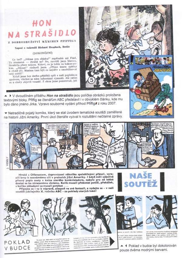 Tři neznámé foglarovské komiksy z ABC[ Autor: Ivo Fencl | zařazeno: 15. 6. 2012 | přečteno 15940 ] V únoru tohoto roku jsem se v Praze sešel s tvůrci mnohosvazkové „Encyklopedie komiksu v Československu 1945-1989“, jejíž druhý svazek ten měsíc právě vyšel. Hovořili jsme s Josefem Ládkem a Robertem Pavelkou také o svazku prvním věnovaném cele časopisu ABC a nelze nepřipomenout tři prakticky zapomenuté foglarovské minikomiksy v tomto časopise! Macek Kosmonaut (námět a kresba Jiří Veškrna pro ABC číslo 12/ročník 11) je dvoudílný komiks o čtyřčlenné partě, který jednoznačně parafrázuje příběh Samoletky a Rychlých šípů, ale jaksi v kombinaci s legendárním příběhem Pérákovým. Kluk zvaný Macek říká ovšem svému deštníku Snášedlo a při skákání si upevní na nohy pera z otomanu. Jediná dívčí členka party mu k tomu dodá i motocyklovou přilbu. Hoch se vrhá z kůlny a kupodivu proletí (jako nějaký Širokko) hned několik zahrad. Odrazí se i od střechy domu, i od vozidla, a po závěrečném přeskoku krávy končí se štěstím ve stohu. Za poklady starých Inků je foglarovci rovněž trochu opomenutý Foglarův námět rozkreslený ve svém úvodu Jaromírem Veselým do dvouřádkového komiksu v ABC číslo 1/ročník 10. Na nejmenovaný zámek přichází historik Pedro Olfanset, aby se probral starými rodovými artefakty, a po týdnu třídění objeví tajemné listiny naznačující existenci chrámů Inků. Hrabě nelení a vyzve Olfanseta (není to jméno snad nějaký kryptogram jména Foglar?), aby se připojil k chystané výpravě do jihoamerických pralesů. Putování za pokladem starých Inků má sice tři díly a soutěž je prokazatelně Foglarovou prací ve stylu jeho Alvareze, kdy čtenáři ABC řešili ve třech číslech deset úkolů, ale komiks byl jenom v čísle prvním. Nu, a seriál Pionýrská vývěska - v ABC č. 6/ročník 9? Možná také ukrývá Foglarův námět, i když pro změnu kresebně zpracovaný Jiřím Hanušem, a to jako čtyřobrázkový strip - v rubrice KOMPAS, která začala vycházet roku 1963. A dodejme jen to, že jde o umně ukrytou reklamu na román Tajemná Řásnovka (1965).