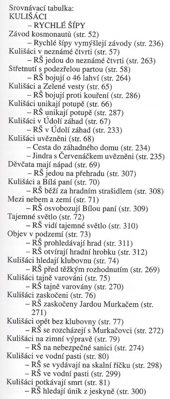 Srovnávací tabulka Kulišáci – Rychlé šípy (čísla stran v závorkách uvádějí strany v publikacích Svorní gambusíni a Rychlé šípy) ![]() ![]() Oficiální reedice se Kulišáci nikdy nedočkali. Jestřáb se k nim zachoval dosti macešsky a přepsáním a překreslením na Rychlé šípy je odsoudil k zapomnění. Ve Vápenkově sešitě Kreslené seriály Jaroslava Foglara z roku 1987 jim byla věnována jen jedna stránka s výčtem základních dat a bez ukázky. Ve stejnojmenné rozšířené publikaci z roku 1990 jsou Kulišáci dokonce zmíněni jen v úvodu věnovaném Rychlým šípům. Tak se stalo, že dosud jedinou reedicí kompletního seriálu byl sešit, který jsem sestavil pro přátele a fandy Foglarova díla v září 1989. Byl rozmnožen xeroxem v počtu několika desítek černobílých číslovaných kopií (některé obálky měly zelenou barvu). Sešit obsahoval kromě seriálu přesná data jednotlivých příběhů. Na polokartonových deskách s Kráslovou kresbou Kulišáků nad skalní říčkou byla také uvedena srovnávací tabulka překreslených příběhů Rychlých šípů a několik dobových ohlasů na seriál z časopisů ABC a Tramp z let 1964 až 1968. O tom, že pět příběhů Kulišáků se dočkalo i „zahraniční“ verze, ví dnes již jen několik pamětníků a specialistů. Úvodní příběhy 1 až 4 a 6 vyšly na Slovensku v číslech 2 až 6 IV. ročníku časopisu ABC pionierov v roce 1963. Pokud jde o tuto knihu (souborné vydání Svorní gambusíni a jiné příběhy, Olympia 1999 a 2003 – pozn. red.), editor respektoval jedno z posledních přání Jaroslava Foglara a rozhodl se Kulišáky zařadit navzdory tomu, že jejich větší část byla přepsána a překreslena do seriálu Rychlých šípů. Kulišáci si to zaslouží jednak proto, že jsou druhým nejdelším Foglarovým kresleným seriálem, ale hlavně proto, že sehráli důležitou roli při nastartování druhé vlny zájmu o Foglara na začátku šedesátých let. Ta ho během několika let vynesla opět na přední místo zájmu veřejnosti, hlavně dětí. Vykreslení postav a dějové zápletky jsou jasně foglarovské, vedou vždy a ve všech dobách stejným směrem – k aktivitě, kamarádství a soudružnosti. Sotva se najde někdo, kdo by chtěl dnes Jestřába podezírat z ideového spříznění s pionýry. Byla to tehdy šance – a on ji využil. Při přípravě této knihy hrozilo nebezpečí, že se bude muset seriál „sejmout“ ze starých čísel ABC, ale při přípravných pracích se podařilo objevit většinu originálů Kráslových kreseb. Jiří Krásl některé kresby opravil a upravil, aniž do nich hlouběji zasahoval. Nakreslil i zcela nový titulní obrázek, protože ten původní v časopisu ABC měl letní motiv, přičemž děj seriálu začíná v zimě. Texty v neobvyklých „bublinách“ byly se souhlasem Jaroslava Foglara upraveny, aby byly dnešním čtenářům srozumitelnější. Přechodové texty zachycující obsah předešlého děje ztratily význam, a tak byly rovněž redakčně upraveny. Dalším z mála zásahů editora do seriálu je jeden zcela nový titulek „Střetnutí s podezřelou partou“. Všechny texty v bublinách byly pro tuto knihu nově vysázeny, aby byly dobře čitelné a hlavně jednotné. Moderní zpracování a kvalitnější papír a tisk daly Kulišákům proti původnímu vydání z šedesátých let vyniknout. Rekapitulace vydání seriálu Kulišáci: 1. 1963 – 1966, časopis ABC mladých techniků a přírodovědců, VII. až X. ročník 2. 1987 – samizdat Kulišáci 3. 1999 – část souborného vydání Svorní gambusíni a jiné příběhy, Olympia (dotisk 2003) Pozn.: Text, obrázky a tabulka jsou převzaty z publikace Svorní gambusíni a jiné příběhy, Olympia 1999 a 2003; aktualizováno a doplněno.