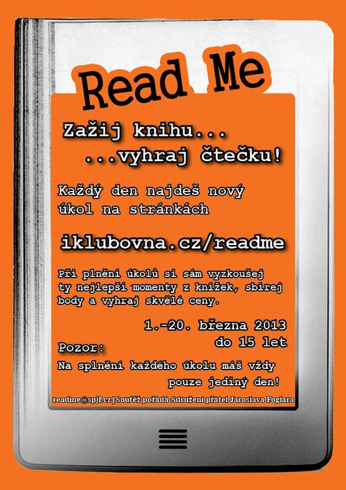 Read Me! Zažij knihu, vyhraj čtečku! Čtenářská soutěž 1.-20. března[ Autor: Kateřina Sloupová - Drobek | zařazeno: 28. 2. 2013 | přečteno 10769 ]Tato bezplatná soutěž pořádaná Sdružením přátel Jaroslava Foglara je určena nejen čtenářům, kteří hledají tipy na zajímavé knížky nebo by si je rádi četli na nové čtečce, ale i těm, které čtení moc nebaví a chtěli by vědět, co se v knihách vlastně děje. Prostřednictvím 20 úkolů se seznámíš s 20 knihami pro děti a mládež: staršími i moderními, českými i zahraničními, dobrodružnými i zábavnými. Při plnění úkolů si vyzkoušíš, co postavy z příběhů zažily, na vlastní kůži. Pravidla soutěže Read Me 1. O co v soutěži jde? Read Me neboli Čti mě. Tato bezplatná soutěž je určena nejen čtenářům, kteří hledají tipy na zajímavé knížky nebo by si je rádi četli na nové čtečce, ale i těm, které čtení moc nebaví a chtěli by vědět, co se v knihách vlastně děje. Prostřednictvím 20 úkolů se seznámíš s 20 knihami pro děti a mládež: staršími i moderními, českými i zahraničními, dobrodružnými i zábavnými. Při plnění úkolů si vyzkoušíš, co postavy z příběhů zažily, na vlastní kůži. Soutěž pořádá Sdružení přátel Jaroslava Foglara s cílem rozvíjet smysluplnou volnočasovou činnost dětí a mládeže. 2. Přihlášení Přihlásit do soutěže se může každý, komu v průběhu soutěže bude méně než 16 let. Chceš-li se soutěže zúčastnit, přihlas se na stránce iklubovna.cz/readme, kde nalezneš odkaz na jednoduchý formulář k vyplnění. Přihlásit se můžeš i po zahájení soutěže, nemohou ti ale být hodnoceny již vypršelé úkoly. 3. Průběh Každý den počínaje 1. březnem 2013 a 20. březnem 2013 konče bude v 6:00 ráno (tolerance +- 60 minut) vyvěšen na webu iklubovna.cz/readme nový úkol. Objeví se v přehledové tabulce s úkoly i jako samostatný článek. Možnost odeslání řešení či zprávy o plnění je do 24 hodin od vydání úkolu (přesný čas vydání bude uveden v tabulce). Příklad: Úkol bude zveřejněn ve středu 6:20, můžeš tedy posílat řešení do čtvrtka 6:20. Úkoly budou různého typu a zaměření. To, jak dobře je splníš, bude ohodnoceno body (maximum, které můžeš získat bude u každého úkolu uvedeno). Řešení nebo zprávy o plnění odesílej na e-mail readme@spjf.cz. Úkoly plníš sám, není-li ve znění úkolu uvedeno jinak. Dáváme ti důvěru, že všechny budeš čestně plnit tak, aby ani nejmenší pochybnost či výčitky svědomí nemohly pokazit tvou radost z výhry. 4. Hodnocení a vyhlášení Hodnocení jednotlivých úkolů bude bude zveřejněno nejpozději do čtyř dnů od uzavření úkolu (například úkol vydaný ve čtvrtek v 6:00 je možné plnit do pátku 6:00 a nejpozději v úterý ráno se dozvíš, na kolik bodů jsi jej splnil). Body budou zapisovány do tabulky přihlášených účastníků. Konečné pořadí bude vyhlášeno 21. března 2013 večer. Ceny budou známy již během soutěže (půjde o elektronickou čtečku knih, komixy, knihy deskové hry apod.) a výhercům budou zaslány do 10. dubna (pokud v přihlášce neuvedeš adresu,ozveme se, abys nám ji napsal a my ti mohli poslat cenu). Každý účastník, který nám napíše svou adresu, obdrží po skončení soutěže diplom. Pro další informace a přihlášení navštiv iklubovna.cz/readme!