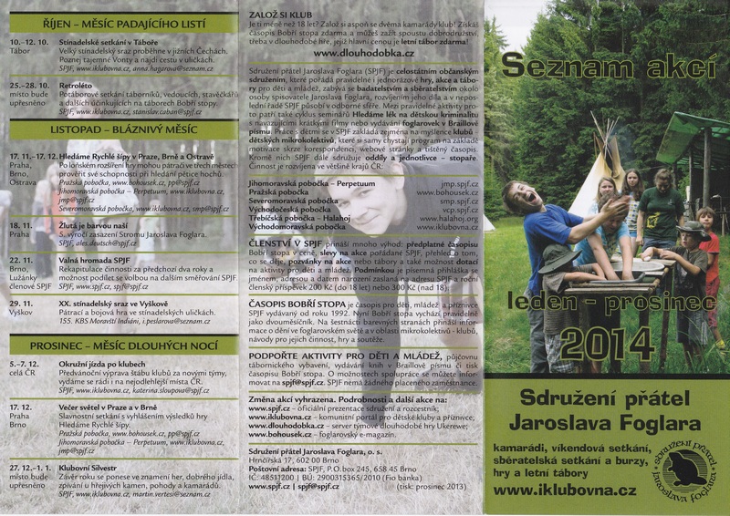 Sdružení přátel Jaroslava Foglara (SPJF) vydalo na konci loňského roku vedle dvojčísla 4-5 Bobří stopy také Seznam akcí leden - prosinec 2014. Obsahuje přehled hlavních akcí celostátního charakteru i setkání a her poboček, klubů a oddílů SPJF. Tak např. v lednu se uskuteční vzpomínkové pietní setkání u hrobu Jaroslava Foglara u příležitosti 15. výročí jeho úmrtí (23.1.) nebo Zimní setkání klubů SPJF (30. 1. - 1. 2.). V únoru se bude konat v Třebíči pátý ples Halahoje (Třebíčské pobočky SPJF), dvě brigády na MUNĚ (základně SPJF v Mikulovicích ve Slezsku), Zimní tábor SPJF u rybníka Kuchyně. Březen bude patřit nejen tradičnímu Jaru s těšítky, ale také setkání mladých věřících pod patronací Třebíčské pobočky SPJF ve Starči. Jihomoravská pobočka SPJF zase chystá jarní vandr do Bílých Karpat. V dubnu přijde čas Šalinění a vandru Jihomoravské pobočky za úzkokolejkami. V květnu se bude konat např. setkání klubů dlouhodobé hry Ukerewe a Pohár Bobří stopy ve fotbale. 8. 6. dojde na tradiční stíhací běh Brno - Adamov a 14. 6. na setkání pamětníků ve Sluneční zátoce. Východočeská pobočka SPJF zase připravuje Výpravu za neznámou horou.
