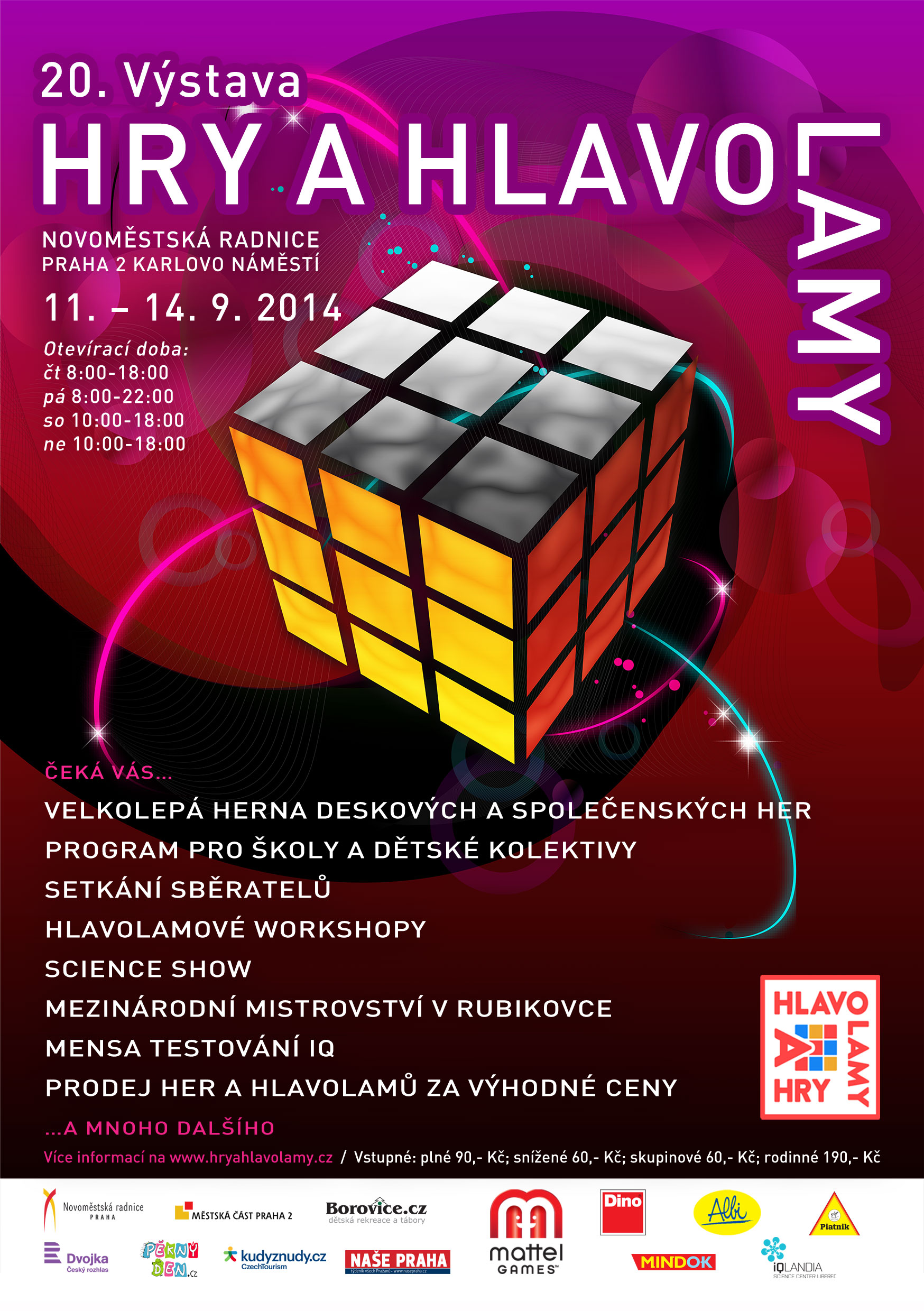 20. Výstava Hry a hlavolamy v Praze: Čtyři dny plné zábavy, her a poznávání[ Autor: | zařazeno: 6. 9. 2014 | přečteno 11204 ] V termínu 11. – 14. září 2014 proběhne v Praze 2 na Novoměstské radnici již 20. Výstava Hry a hlavolamy. Děti i dospělí návštěvníci se mohou těšit na desítky deskových her i výstavu mechanických hlavolamů ze sbírky patrona výstavy RNDr. Jaroslava Flejberka. Připravena je i řada doprovodných programů – pro školy a dětské skupiny jsou to přednášky a workshopy. Dále se mohou návštěvníci těšit na Science show i testování IQ v režii Mensa ČR a Součástí výstavy bude také dvoudenní mezinárodní mistrovství ve skládání Rubikovy kostky.Datum: 11. – 14. 9. 2014 Místo:Novoměstská radnice, Karlovo náměstí 1/23, 120 00 Praha 2 Otevírací doba: čtvrtek 8 – 18 h, pátek 8 – 22 h, sobota a neděle 10 – 18 h Vstupné: plné 90 Kč, snížené 60 Kč, rodinné 190 Kč, skupinové 60 Kč Výstava je určena pro děti i dospělé, kteří si rádi hrají, připraveno bude množství hlavolamů z celého světa, samozřejmě včetně novinek a zajímavostí. „Asi nejoblíbenější je na celé výstavě velká herna deskových her. Můžete přijít ráno a hrát si celý den v kuse. Navíc jsme letos prodloužili v pátek hernu až do 22 hodin,“ láká na výstavu její ředitel Pavel Hofrichter. V této prostorné herně se během čtyř dnů, kdy výstava probíhá, představí kolem stovky nových, ale i léty prověřených deskových her, jako je třeba oblíbená slovní hra Scrabble. Herní instruktoři všem rádi poradí s výběrem a pravidly her. Na výstavě bude možné si hry i hlavolamy koupit za výhodné ceny, vyberte si zde tedy skvělé vánoční dárky s předstihem. Ve čtvrtek a v pátek jsou na výstavě připraveny naučné programy pro školy. Jedná se o přednášky z oblasti hlavolamů, logiky, a rébusů a také workshopy, v jejichž rámci si mohou účastníci za asistence instruktorů vyzkoušet desítky hlavolamů a dozvědět se o nich mnoho zajímavostí i tipů na řešení. Mezi další lákadla patří například science show, testování IQ nebo sobotní setkání sběratelů a autorů hlavolamů. Skvělou podívanou i napětí přinese bezesporu víkendové mezinárodní mistrovství ve skládání Rubikovy kostky. Na něm se představí 15 známých i méně známých disciplín ve skládání tohoto celosvětově proslulého hlavolamu. Výstava probíhá pod záštitou starostky Městské části Praha 2 Mgr. Jany Černochové. Výstava Hry a hlavolamy ve zkratce: