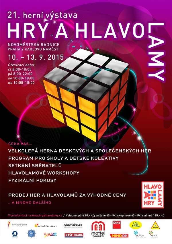 Cenami v této soutěži jsou vstupenky na tuto akci, pořádanou od 10. do 13. září 2015 v prostorách Novoměstské radnice na Karlově náměstí 1/23, Praha 2. Tentokráte mohou soutěžit jak jednotlivci, tak i skupiny dětí a mládeže či oddíly. Pro jednotlivce jsou připraveny dvě vstupenky pro jednu osobu a tři rodinné vstupenky (2 dospělí+3 děti), pro skupiny je připraven jeden vstup zdarma pro členy skupiny do maximálního počtu 20 lidí. Soutěž pro jednotlivce: V naší soutěži nabízíme za správnou odpověď na soutěžní otázku možnost získat zdarma vstupenky. Ty nám poskytl pořadatel akce. Celkem máme připraveny dvě vstupenky pro jednotlivce a tři rodinné (2+3) pro vylosované soutěžící, kteří nám pošlou správnou odpověď na otázku: „Jak je nazýván hlavolam, o kterém se píše v knize Záhada hlavolamu od spisovatele Jaroslava Foglara?“. Správnou odpověď na naši otázku zašlete na e-mailovou adresu soutez@crdm.cz, a to nejpozději do 2. září 2015. Do předmětu e-mailu napište: Soutěž Hry a hlavolamy. Do zprávy nezapomeňte připsat své jméno a příjmení. Pokud se soutěže zúčastníte a zároveň jste vlastníkem karty EYCA - Evropská karta mládeže, www.EYCA.cz, nezapomeňte tuto informaci připsat do mailu s odpovědí! Máme připraveno menší překvapení. Pět jmen soutěžících, kteří zašlou správnou odpověď, bude vylosováno 3. září 2015 a výherci budou odměněni. Informace o tom, kdo vyhrál, bude zveřejněna na internetové adrese www.ADAM.cz/soutez. Pravidla „Soutěže pro jednotlivce o vstupenky na 21. herní výstavu HRY A HLAVOLAMY“ Soutěž pro oddíly, skupiny dětí a mládeže: Soutěží se o vstup zdarma pro celý oddíl, skupinu dětí a mládeže (max. 20 lidí). Vyhrává jeden vylosovaný oddíl, skupina dětí a mládeže. Do slosování je zařazen oddíl, jehož člen, členka nebo vedoucí nám zašle jména alespoň tří herních partnerů (výrobců her) 21. herní výstavy HRY A HLAVOLAMY. Každý oddíl, skupina dětí a mládeže může být zařazena do slosování jen jednou. Duplicity budou vyřazeny. Správnou odpověď na náš úkol zašlete na e-mailovou adresu soutez@crdm.cz, a to nejpozději do 2. září 2015. Do předmětu e-mailu napište: Soutěž Hry a hlavolamy. Do zprávy nezapomeňte připsat název oddílu nebo skupiny dětí a mládeže, své jméno a příjmení. Pokud se soutěže zúčastníte a zároveň jste vlastníkem karty EYCA - Evropská karta mládeže, www.EYCA.cz, nezapomeňte tuto informaci připsat do mailu s odpovědí! Máme připraveno menší překvapení. Název oddílu nebo skupiny dětí a mládeže, jehož člen, členka nebo vedoucí zašle správnou odpověď, bude vylosován 3. září 2015. Informace o tom, kdo vyhrál, bude zveřejněna na internetové adrese www.ADAM.cz/soutez. Nápovědu najdete na stránce www.hryahlavolamy.cz. Pravidla „Soutěže pro oddíly, skupiny dětí a mládeže o vstup na 21. herní výstavu HRY A HLAVOLAMY“ Všem soutěžícím přejeme hodně štěstí! Redakce ADAM.cz