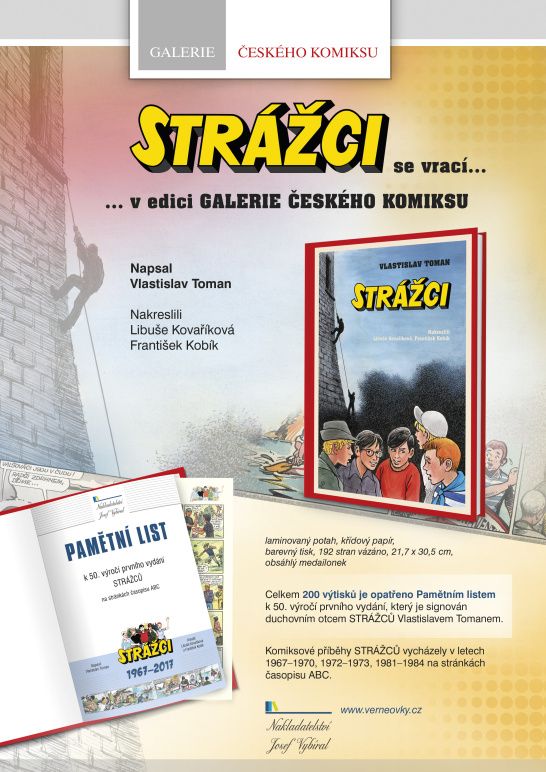Ale zpátky k jubilantům, tedy Strážcům. Své předchůdce měli v raketové posádce s názvem Kulišáci, jejíž příhody pro ábíčko psal Jaroslav Foglar a kreslil Jiří Krásl. Po létech nucené odmlky se tak Foglar pravidelně objevoval na stránkách ABC (1962/66) a poté postupně začaly vycházet i jeho knížky, ba i milovaný seriál Rychlé šípy. Právě to posléze Foglara vedlo k tomu, aby psaní Kulišáků pro ABC ukončil. Ukázalo se však, že si čtenáři ABC – a nejen členové jeho klubů – takový komiks přejí mít i nadále. V redakci jsme se radili, jak tuto situaci vyřešit, a nakonec byl přijat můj návrh, že se pokusím nějaký námět předložit. Měl jsem dost vzpomínek na klukovská léta, která jsem prožil v Plzni, kde jsem se i narodil. Bydleli jsme ve starší části města zvané Petrohrad, ale na polích a loukách, kde jsme třeba pouštěli draky, už v šedesátých letech bylo sídliště. Zůstal však lesopark Homolka a břehy řeky Radbuzy i romantické okolí města. Prostředí jsem tedy měl a partu, která se měla stát klubem ABC, jsem vytvořil ze svých kamarádů z klukovských let. Jen jména jsem trochu přeonačil. Z Míry Lišky se stal Jenda/Honza Drábek, Zdeněk Vřešťál byl Kájou Horákem, třídní rošťák Vláďa Bednář byl vzorem pro Robina Lišku, zatímco z blonďatého Václava Štekla jsem udělal Zrzka, čili Vaška Štětku. S pátým členem mi pomohla moje dávna přezdívka Hadži a tak jsem se stal Božou Rakem. V předvečer padesátého výročí startu seriálu o Strážcích musím bohužel konstatovat, že z oné pětice naživu jsem už jenom já. Změnila se však i mnohá místa, kde Strážci prožívali své příběhy. Zmizely třeba Chvojkovy lomy, z nichž jsou stadiony a zůstalo jméno ulice U lomů, zastavěna je část „prérií“, což byly břehy Radbuzy, jiná je i farská zahrada a pozměněn je i „náš“ dům v Táborské ulici… Mohl bych ještě pokračovat, zachovejme si však Petrov a Slovanku, jak jsem naše čtvrti pro seriál přejmenoval, takové, jaké byly v době Strážců. Můžeme se tam spolu vrátit nejen ve vzpomínkách, ale přizvat i dnešní kluky a děvčata, když zalistujeme v souborném vydání komiksu, které pod názvem Strážci právě vydalo Nakladatelství Josefa Vybírala. Obálka je dílem Jiřího Petráčka. Najdete tu všech 176 stran komiksu, které postupně kreslili Libuše Kovaříková a František Kobík, a ještě plno zajímavého čtení i obrazových reprodukcí. Chcete knihu s podpisem autora? Na knižním veletrhu Svět knihy, který se koná v Praze na Výstavišti, vám knihu podepíše Vlastislav Toman v sobotu 14. května 2016 od 14 do 16 hodin ve stánku Nakladatelství J. Vybírala - L 113 (levé křídlo).
