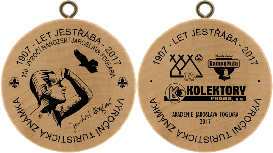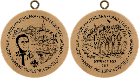První suvenýr – Jestřábův let (1907 – 2017) – je věnován letošnímu 110. výročí narození Jaroslava Foglara. Známka je „oboustranná“, čili s odlišnými motivy na lícové i rubové straně. Líc zobrazuje Jestřába vzhlížejícího zasněně do dáli. Grafika byla zpracována podle historické fotografie z jednoho z prvorepublikových táborů Pražské Dvojky ve Sluneční zátoce. Připojen je Foglarův podpis. Na obloze se vznáší silueta dravce-jestřába, která je společným symbolem pro všechny akce letošního jubilea v rámci projektu Akademie Jaroslava Foglara. Na rubové straně jsou prezentováni partneři projektu Let Jestřába – Kmen dospělých Junáka, sdružení KampaNula a společnost Kolektory Praha. Druhá VTZ je vydána k letošnímu otevření Muzea Jaroslava Foglara na Hradě Ledeč nad Sázavou. Ač se výstavní sály ještě průběžně upravují a doplňují, základní část expozice je už přístupná veřejnosti. Také tento suvenýr využívá obě stany dřevěné vypalované placky k odlišným motivům: Líci dominuje ledečský hrad s podobiznou Jaroslava Foglara. Kresba zachycuje spisovatelovu podobu přibližně na sklonku 60. let, kdy se opět – po dvou desetiletích nucené tvůrčí pauzy – zvedla stavidla vydávání jeho knih a kreslených seriálů v ohromných nákladech. Rovněž zde nechybí spisovatelův autogram. Na rubu VTZ Muzeum Jaroslava Foglara je kresba Rychlých šípů pod ledečským hradem. Autorem obrazu je Milan Teslevič, hlavní tvůrce a kurátor muzejní expozice. Stejná barevná kompozice s postavami v životní velikosti zdobí i vstupní prostor muzea v poschodí hlavní budovy ledečského hradu. |