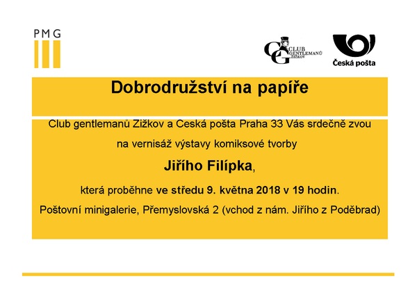 Club gentlemanů Žižkov a Česká pošta Praha 33 vás srdečně zvou na vernisáž výstavy komiksové tvorby Jiřího Filípka, která proběhne ve středu 9. května 2018 v 19 hodin.
