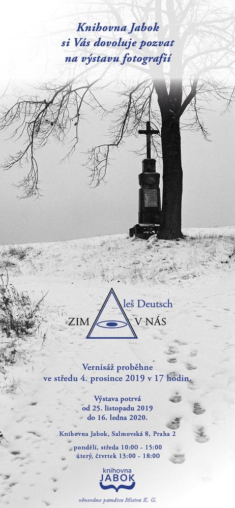 Foglarovec Aleš Deutsch zve na výstavu svých fotografií Zima v nás. Výstava se koná v knihovně Jabok v Salmovské ul. č. 8 Praha 2, a potrvá od 25. listopadu 2019 do 16. ledna 2020. Otevřeno je v pondělí a ve středu v 10 - 15 hod., v úterý a ve čtvrtek ve 13 - 18 hod.