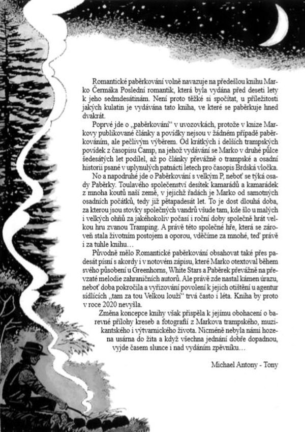 Výbor starších i novějších textů Marko Čermáka - povídek a článků věnovaných trampskému dávnověku i současnosti, doplněný velkým množstvím autorových černobílých i barevných kreseb a fotografií vyjde u příležitosti osmdesátých narozenin M. Čermáka zhruba v polovině března.