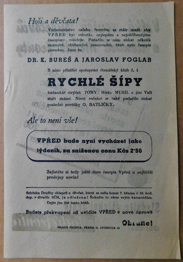 Tak teď zbystřete pozornost – v redakci Vpředu se něco velkého chystá. Časopis nyní povedou Dr. K. Bureš a Jaroslav Foglar.