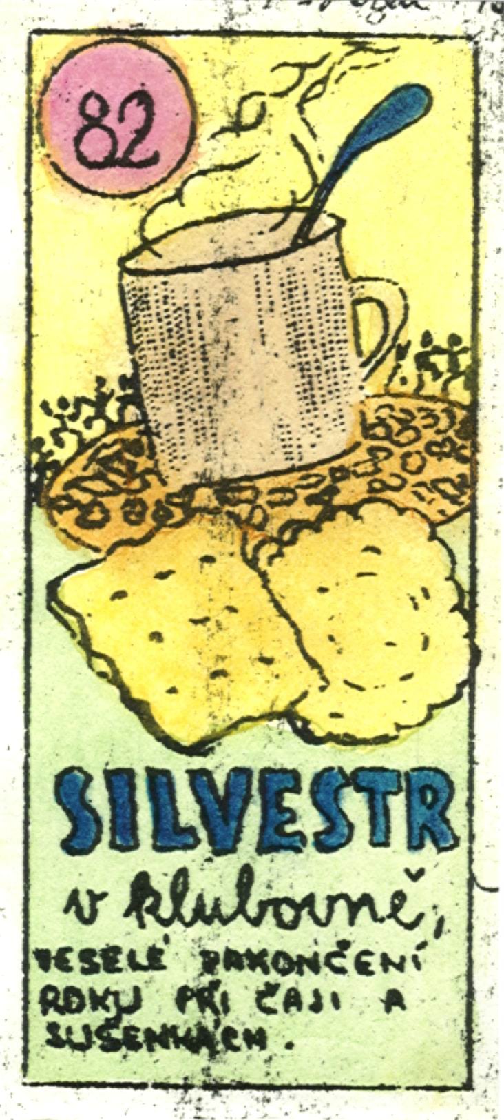 Kartička Pražské dvojky Silvestr. Také tato akce byla dobře navštěvovaná. Uvařil se kotel čaje, každý přinesl z domova nějaké vánoční pečivo, a pak už jsme se jenom bavili, hráli různé hry.