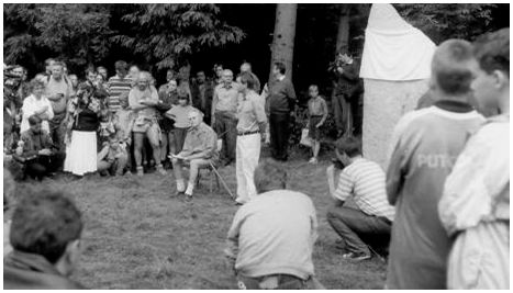 Po slavnostním odhalení následovala autogramiáda. Atmosféru tehdy tak trochu narušili provozovatelé tábora, kteří odmítli do nedalekého sportovního areálu TJ Bohemians vpustit automobil, který přivezl Jaroslava Foglara, tak aby mohl vystoupit z auta co nejblíže pomníku. Musel zasáhnout starosta Ledče nad Sázavou Jan Hálek. Táborníci tehdy účastníkům akce dokonce vymezili lanem přesné koridory, kudy se pohybovat a s despektem sledovali celou akci zpovzdálí.