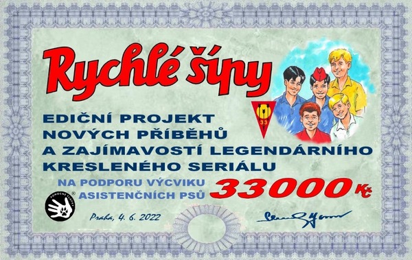 „Díky prodeji publikace Rychlé šípy 33 už byla výcvikovému centru Pomocné tlapky předána částka 33 tisíc korun,“ říká Hana Kaprálková, členka náčelnictva Kmene dospělých skautů a skautek Junáka, která jménem vydavatele předala benefiční šek ředitelce obecně prospěšné společnosti Pomocné tlapky Haně Pirnerové. Stalo se tak při „promoci“ nově vycvičených psů na počátku června v Praze.