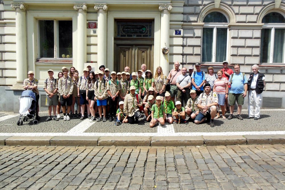Rodný dům Jaroslava Foglara - středa, 6. července 2022, 13 hodin, 13 minut[ Autor: Martin Rosol | zařazeno: 24. 7. 2022 | přečteno 8533 ] Rekordně vysoká účast provázela letošní setkání foglarovců u rodného domu Jaroslava Foglara při příležitosti 115. výročí spisovatelova narození! Setkání kromě celé řady známých i neznámých foglarovců navštívil oddíl skautů a skautek ze 7. sboru Slánských vlků z Prešova, který táboří v Roztokách u Prahy, a při svých výpravách do metropole se věnuje především poznávání odkazu Jaroslava Foglara. Skauti ze Slovenska se účastní poznávací hry Rychlé šípy v Africe, navštívili též výstavu Město jako přízrak. Také jejich táborová hra je tématicky zaměřena na Rychlé šípy, a vlajka Rychlých šípů se stala hlavním symbolem jejich táborového odznaku. A když se k setkání se zájmem připojilo i několik náhodných kolemjdoucích a nájemníků z domu v Benátské ulici č. 3, mohli jsme napočítat rovnou půlstovku účastníků!