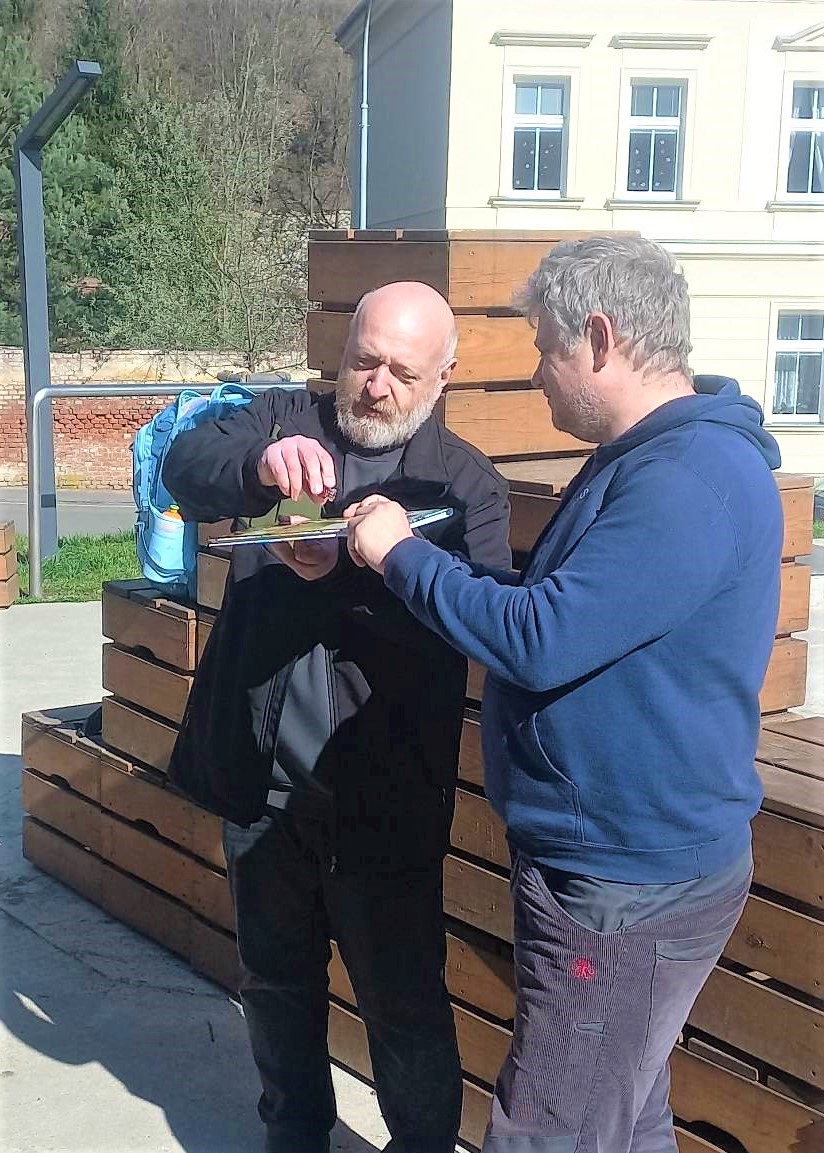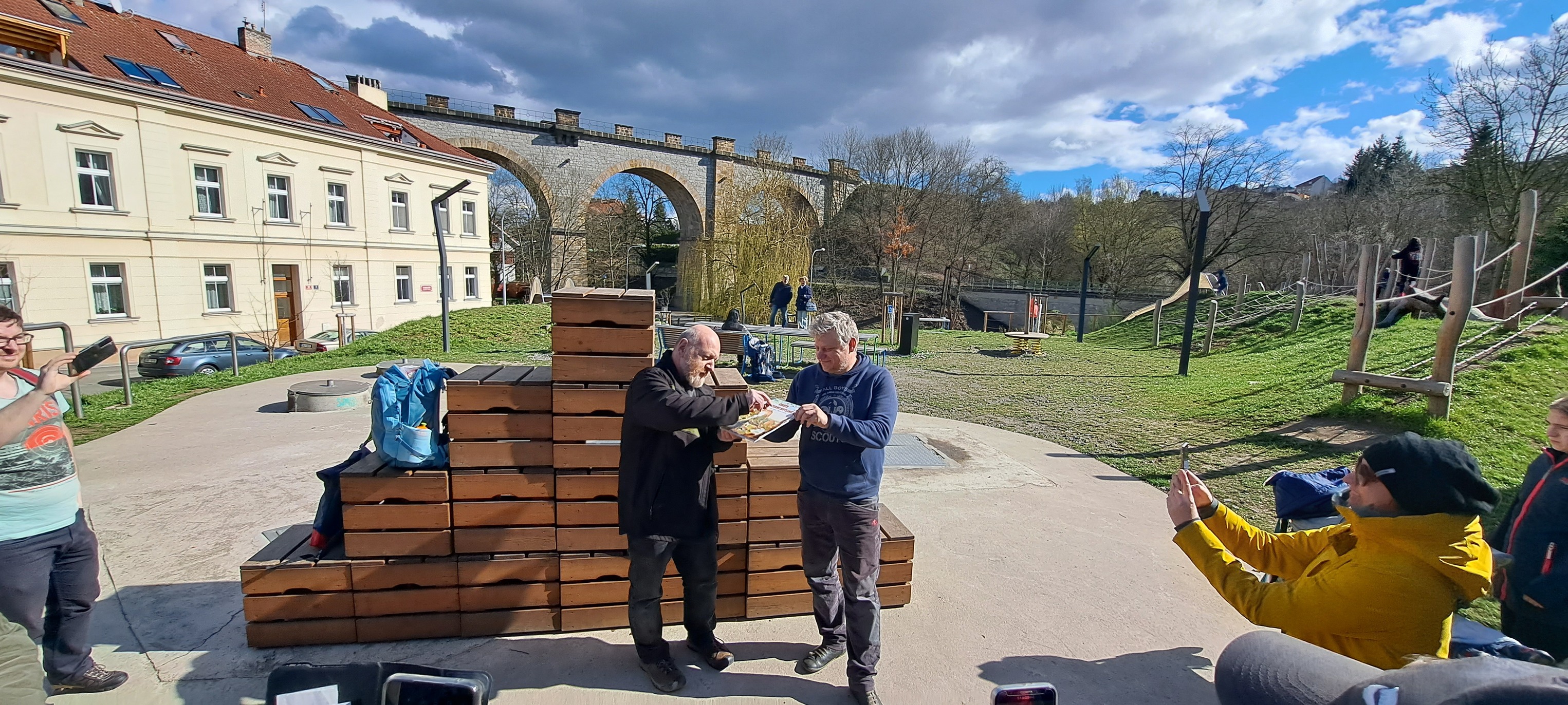 Na dětském hřišti u viaduktu v pražských Hlubočepích v sobotu 25. 3. 2023 odpoledne po uvedení do provozu nové dřevěné vyřezávané lavičky Jaroslava Foglara Milan Lebeda - Alpín s Romanem Šantorou – Bobem ze Skautské nadace Jaroslava Foglara pokřtili šafránem před dřevěnými bedničkami (Proč šafrán a proč bedničky? - Znalí vědí!) nové jarem vonící vydání komiksové Chaty v Jezerní kotlině Jaroslava Foglara a Marko Čermáka.