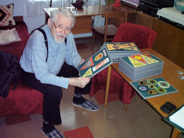 Milé čtenářky a čtenáři Bohouška, kamarádky a kamarádi foglarovci, zvláště pak foglarovští sběratelé! Byl jsem požádán redakcí Bohouška, zdali bych Vám nemohl sdělit něco více o historii a současnosti své sbírky foglarovských odznaků, kterou si můžete až do 5. listopadu tohoto roku prohlédnout na právě probíhající výstavě Rychlé šípy a tajemství Stínadel na Chvalském zámku v Praze. O totéž jsem byl před několika lety požádán Klubem skautských sběratelů Junáka a připravil jsem tehdy celý seriál článků pro zpravodaj ZIPSS, ve kterém jsem jeho čtenářům svoji sbírku blíže představil. Nyní, po dohodě s redakcí Bohouška, bych tento osmidílný seriál v doplněné a aktualizované podobě rád nabídl i Vám. Odznaky! Již od klukovských let se mi líbily ty drobné, elegantní, lesklé a pestrobarevné předměty, které jsme si s kamarády vzájemně vyměňovali, tehdy ovšem ještě bez jakékoli sběratelské koncepce. Vzpomínám, jak jsme se předstihovali, komu se podaří získat co nejdelší a nejpočetnější barevnou sérii! O řadu let později, v době po sametové revoluci, kdy opět začaly vycházet foglarovky a já si je už jako dospělý kupoval a četl, abych dohnal to, co mi bylo komunistickým režimem v dětství odepřeno, vzbudily ve mně tyto knížky hlubší zájem o život a dílo spisovatele Jaroslava Foglara, takže jsem se postupně stal foglarovcem – sběratelem. A jak jinak – soustředil jsem svůj zájem především na foglarovské odznaky. V jarních měsících roku 2014 pak přišla nečekaná nabídka od mého kamaráda a věhlasného sběratele Ivana Vápenky – Ivy k odkoupení jeho zcela mimořádné odznakové sbírky. Moji touhu převzít a pokračovat v Ivanově sběratelské práci poněkud nahlodávala starost, aby cena takto vzácné a rozsáhlé kolekce nebyla nad mé možnosti. Ukázalo se však, že k podobným obavám nebyl důvod: Ivan udal dobrou, hodnotě sbírky zcela přiměřenou cenu, kterou jsem bez smlouvání akceptoval a 28. května 2014 jsem sbírku převzal. Tehdy pochopitelně vyvstala potřeba celou sbírku nově uspořádat k obrazu svému. Bylo třeba rozmyslet, kam a jak odznaky umístit, aby sbírka měla jednotnou úpravu a smysluplnou koncepci. Přemýšlel jsem o různých možnostech. Nakonec, po dlouhých úvahách, jsem se pustil do výroby tabulek o rozměru A4 z materiálu KAPA, což je lehká pěnovka oboustranně polepená tuhým papírem. Tabulky jsem po obou stranách pomocí tyčinek kancelářského lepidla polepil tmavozeleným filcem tloušťky 1mm a jejich okraje olemoval šedým, 2cm širokým tkalounem. Do takto připravených tabulek z Kapy lze odznaky pohodlně zapichovat a díky filcu nejsou vidět dírky po vpichu v případě, kdy je nutno některý z odznaků přemístit. Filc na rubové straně tabulky má funkci ochrannou a zabraňuje poškození odznaků odřením při uložení tabulek na sobě. Odznaky bez jehly – nášivky, medaile či buttony (obecně známé jako „placky“) – je možno připevnit k tabulce pomocí špendlíků. Oproti zakládání odznaků např. do alba mají jednotlivé tabulky ještě další nezanedbatelnou výhodu: V případě vystavování umožňují přehledně umístit celou kolekci vedle sebe a navíc je možné tabulky zavěšovat, připevníme-li k nim pomocí špendlíků a provázku poutka, nebo je jednoduše připíchnout k podkladové desce. Ze samotného sběratelského hlediska však bylo hlavně nutno rozhodnout, ke které z možností uspořádání sbírky se přiklonit: Odznaky je totiž možno řadit: 1) podle druhů (tedy např. zvlášť odznaky kovové, zvlášť medaile, zvlášť nášivky atd.), 2) chronologicky (jak v průběhu let odznaky postupně vznikaly), 3) tematicky (např. týkající se Rychlých šípů, Foglarova oddílu Dvojka, bobříků a podobně). Především z estetických, zároveň však i praktických důvodů jsem se rozhodl preferovat uspořádání sbírky podle druhů (na rozdíl od předešlého Ivanova tematického uspořádání), zároveň však, pokud možno, co nejvíce respektovat i zbývající dvě hlediska. Jako velmi nešťastný se ukázal někdejší Ivanem zvolený způsob upevnění látkových nášivek pomocí oboustranné lepicí pásky. S hrůzou jsem totiž zjistil, že postupem času lepidlo z pásky proniklo do látky! Jenom zanícený sběratel může pochopit moji úzkost z možného poškození nenahraditelných vzácností, když jsem se pomocí čistého technického benzínu snažil prosáklý lep z nášivek (naštěstí úspěšně) odstranit! V průběhu dalších let se mi podařilo sbírku rozšířit natolik, že v současnosti čítá více než 1500 exemplářů odznaků, nášivek, medailí, vlaječek, placek a přívěšků na téma Jaroslav Foglar. Když mě před nedávnem původní majitel a zakladatel sbírky Ivan Vápenka navštívil, aby si prohlédl výsledky pokračování mé sběratelské činnosti, věřil jsem, že nebude zklamán. Byl jsem velice rád, že jsem se nemýlil. Pokračovat alespoň v jedné brázdě vyorané Ivou na jeho širokém foglarovském poli je totiž pro mě zároveň ctí i závazkem. (Zpracováno pro zpravodaj Klubu skautských sběratelů Junáka – ZIPSS 1-2/2020; aktualizováno a doplněno pro Bohouška v září 2023)