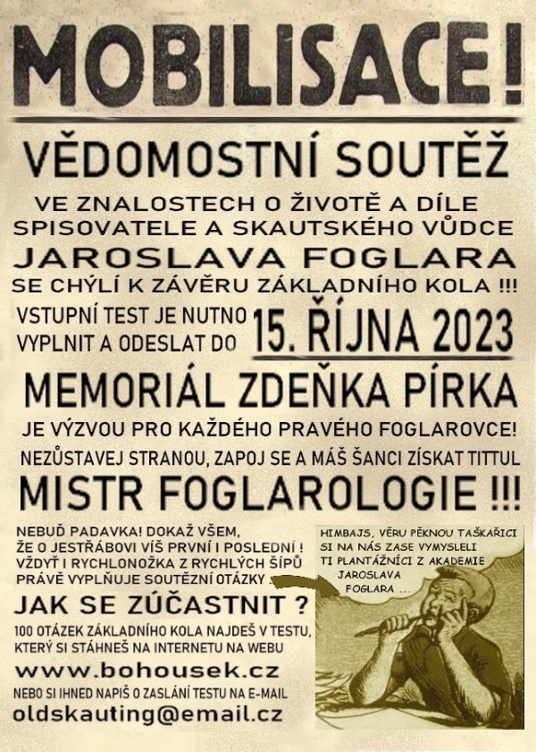 Už rovné čtyři měsíce – od 8. května 2023 – měli všichni příznivci díla Jaroslava Foglara příležitost „poprat se“ s otázkami vědomostního kvízu Memoriálu Zdeňka Pírka ve znalostech o spisovatelově životě a tvorbě. Čas se ale krátí – a na vyplnění testu zbývá už jen týden!