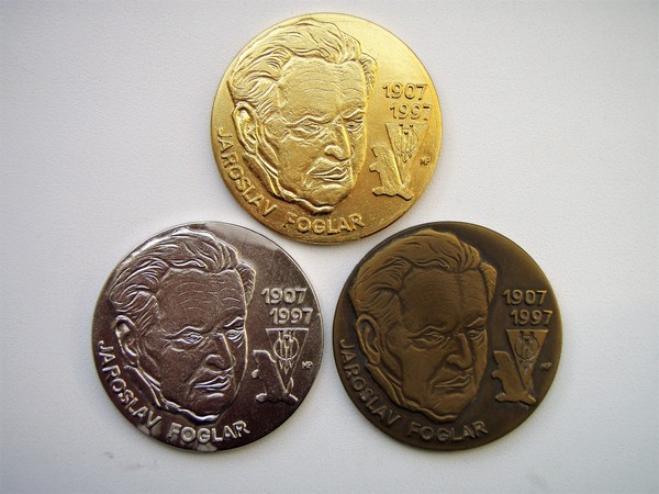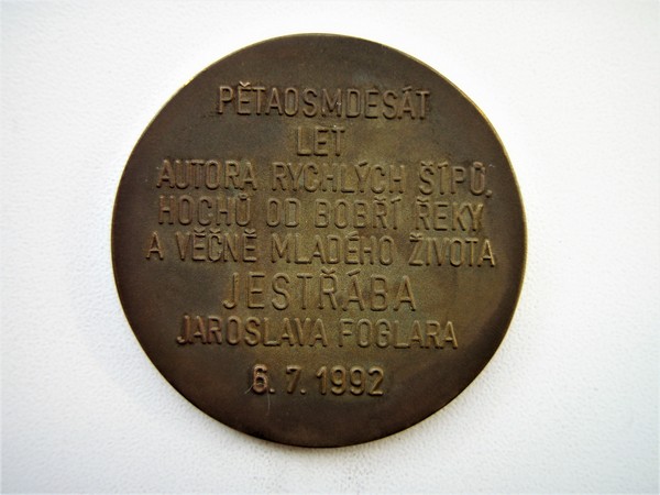 Foglarovské odznaky 5/8 – medaile, plakety a mince[ Autor: Martin Rosol | zařazeno: 6. 1. 2024 | přečteno 8324 ] K dalším druhům foglarovských odznaků, které si bezpochyby zasluhují pozornost sběratelovu patří medaile a plakety. Patrně nejstarší pamětní medaile, která se váže k Jestřábovu jubileu pochází z roku 1987 a připravili ji ve dvojím provedení kovu (stříbro a měď) k jeho osmdesátinám foglarovci z Tanvaldu. (obr. 1) Další z medailí vydaných nejprve k Jestřábovým pětaosmdesátinám a později devadesátinám už nesou podpis nezapomenutelného výtvarníka a foglarovce Vladimíra Pechara – Pluta. Medaile z roku 1992 v provedení zlato, stříbro a bronz představuje na líci čelní portrét Jaroslava Foglara, na rubu pak oslavný text k jeho pětaosmdesátinám (v některých případech zůstala rubová strana hladká). (obr. 2)