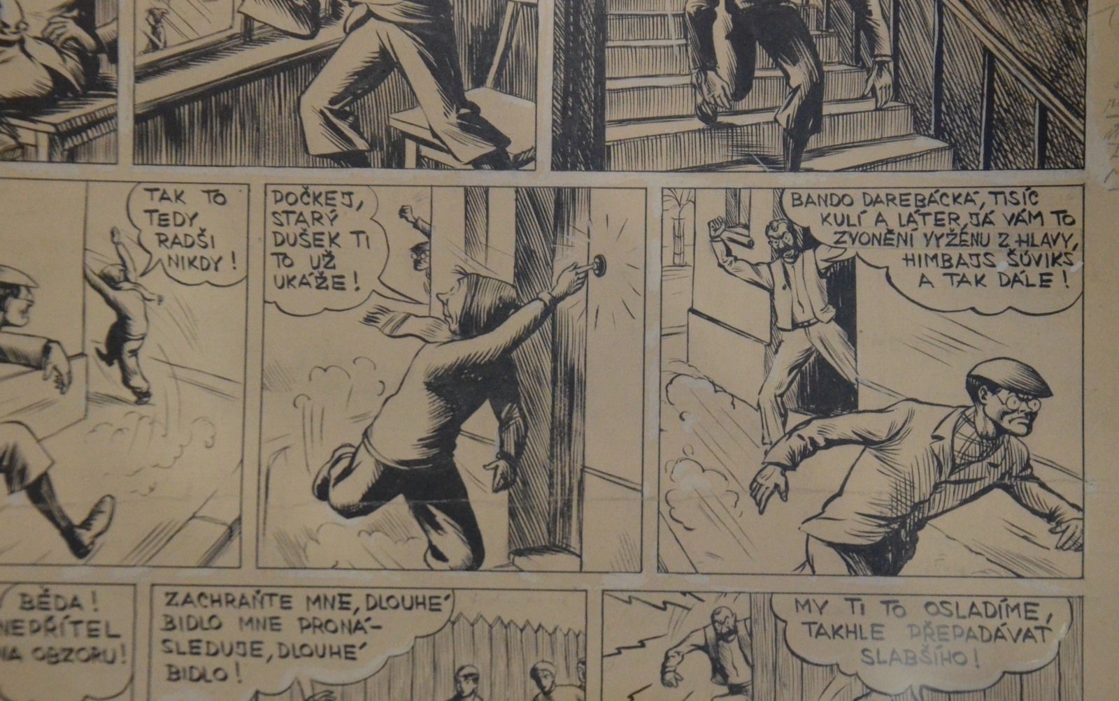 Zhlédnete originály Rychlých šípů které Jestřáb připravoval pro Jana Fischera a Václava Junka. Tito ilustrátoři kreslili komiksový serál, který vycházel v Mladém hlasateli.