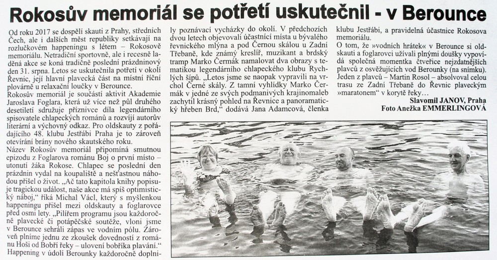 Naopak značný údiv a rozpačité kroucení hlavami způsobil divný komentář čtenáře Petra V. k reportáži „Rokosův memoriál 2024: Skvostné loučení s Berounkou“ (Bohoušek 3. 9. 2024), který se pozastavuje nad absencí fotografií obnažených účastníků Rokosova memoriálu. Rádi bychom znovu zopakovali, že ani na akademické půdě, ani ve sklepě (kde se nachází naše klubovna), ani na žádných akcích pořádaných AJF či 48. Klubem OS Jestřábi naturismus NEPRAKTIKUJEME! Pokud tak někteří činí ve svém soukromí, nelze to s našimi foglarovskými aktivitami jakkoli dávat do souvislosti. K tvrzení Petra V., že skauting a naturismus mají společného zakladatele připomínáme, že ani u jednoho ze zakladatelů skautingu – Roberta Baden Powella, Ernesta Thompsona Setona, nebo u nás Antonína Benjamína Svojsíka není o naturismu ani zmínka!