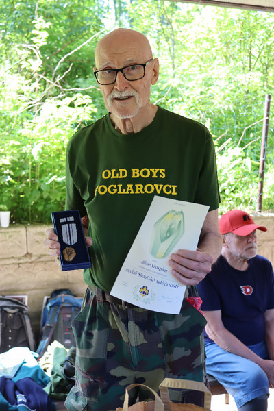 Sluneční zátoka 14. 6. 2025Nákupní horečku rozčeřilo kolem desáté hodiny přivítání přítomných hlasem člena revizní komise SPJF Marka Poláka – Sharpa a krátký proslov jednoho ze tří zakládajících členů SPJF a emeritního předsedy Miloše Vraspíra – Bobra, kterému byla následně předána Medaile skautské vděčnosti, což je ocenění udělované Junákem jako projev hluboké vděčnosti za pomoc skautskému hnutí rodinným příslušníkům skautů a neskautům.