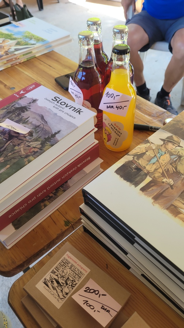 Sluneční zátoka 14. 6. 2025V podloubí ubytovacího zařízení rozbalili své stánky vydavatelé foglarovských materiálů – Václav Vávra, Josef Vybíral, Luboš Trkovský, turistické známky tu prodával, stromečky ginga rozdával a „minigalerii Uko Ješity“ s akvarely Marko Čermáka vystavoval Slávek Janov z Akademie Jaroslava Foglara. Zájem byl i o skautské odznaky, ale bezkonkurenčně nejdelší fronta byla u stolu Skautské nadace Jaroslava Foglara, jejíž pracovníci do zátoky přivezli řadu novinek (např. Mirkova mandarinko-marakujová či Rychlonožkova švestkovo-skočicová lemunáda dodávaná se stylovým otvírákem, obálka na foglarovské autogramy, zápisníky, Slovník českých autorů knih pro chlapce, trička, ponožky, náramky, placky, vinylové desky s Rychlými šípy, kronika Tábora u Sinovíru).