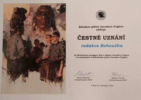 V sobotu 22. listopadu 2025 se v Brně uskutečnila celostátní 17. Valná hromada Sdružení přátel Jaroslava Foglara, jehož jsou všichni tři redaktoři Bohouška dlouholetými členy. Vedení spolku ocenilo naši pětadvacetiletou tvůrčí práci udělením čestného uznání za dlouholetou propagaci díla a odkazu Jaroslava Foglara a za spolupráci se Sdružením přátel Jaroslava Foglara. Čestné uznání za redakci převzal Milan Lebeda – Alpín. Ocenění si vážíme a děkujeme za ně. Alpín, Best, Krizmen více... XXXIV. Setkání skautských sběratelů a Skautská burza 29. listopadu 2025 v Praze[ Autor: Milan Lebeda - Alpín | vydáno: 24. 11. 2025 | přečteno 938 | přidat komentář ]